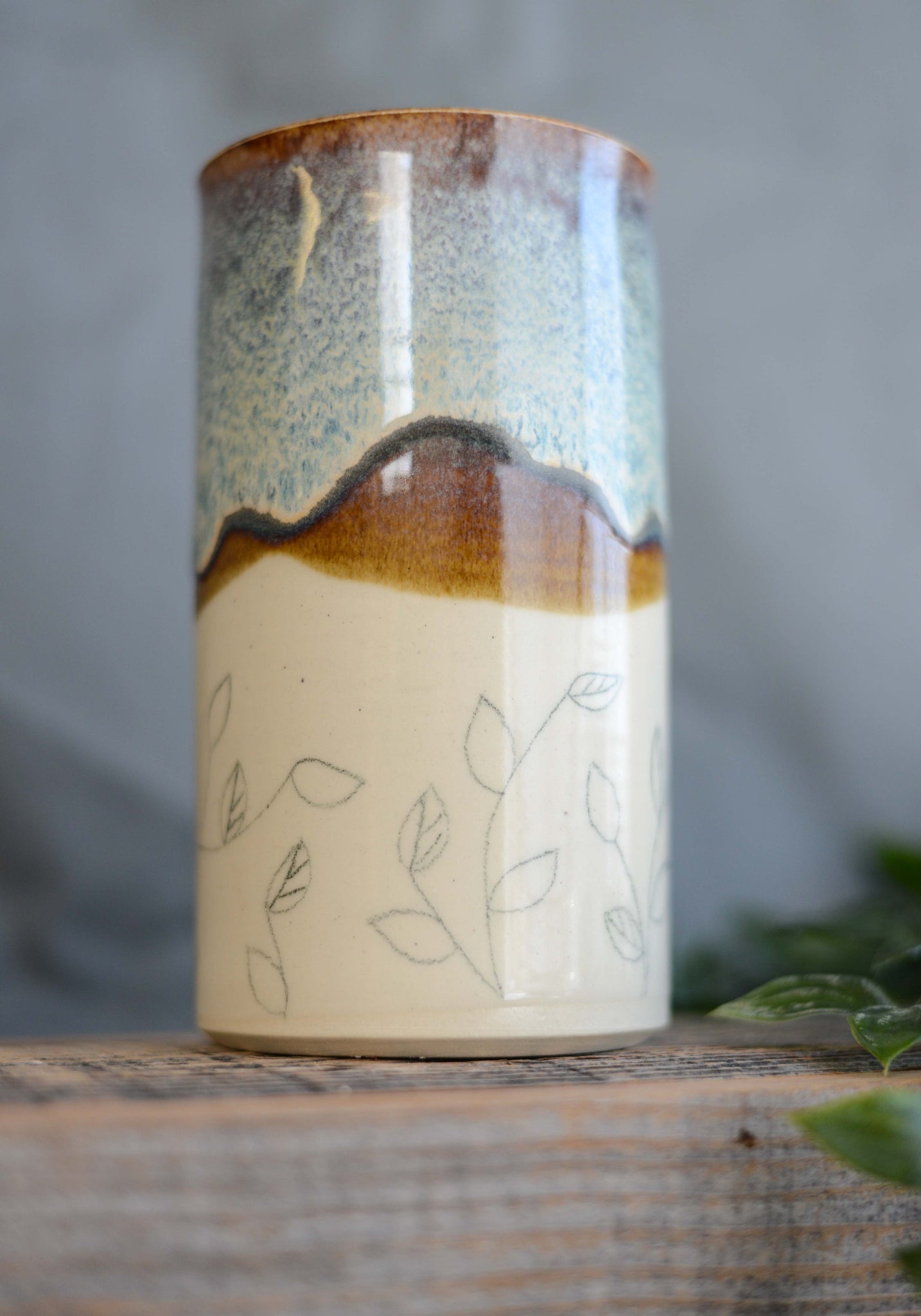 Hand Drawn leaves and vines around the base.